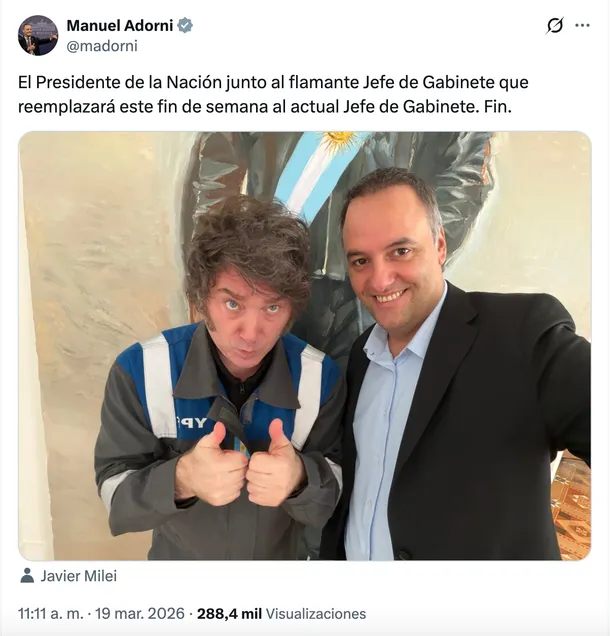 A través de su cuenta oficial, el funcionario publicó una imagen junto al presidente Javier Milei, acompañada por un mensaje irónico: “El Presidente de la Nación junto al flamante Jefe de Gabinete que reemplazará este fin de semana al actual Jefe de Gabinete. Fin.”.
