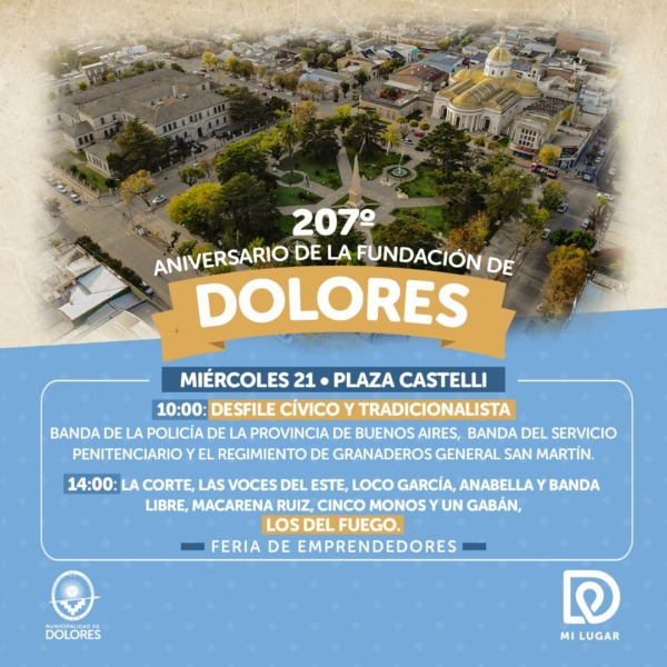 En el marco del 207º Aniversario de la Fundación de la ciudad, la Municipalidad de Dolores invita a los vecinos a los festejos que se llevarán a cabo el 21 de agosto en Plaza Castelli.