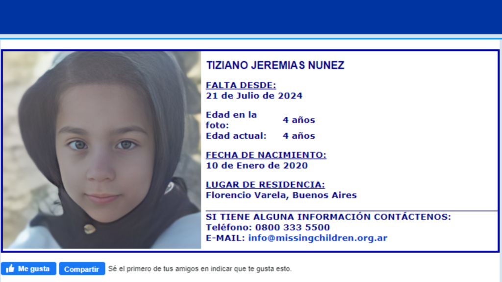 Tiziano Jeremías Núñez, de 4 años, desapareció el 21/7 en Florencio Varela. Es intensamente buscado por su familia, que ya radicó una denuncia policial. En caso de datos contactarse al 911.