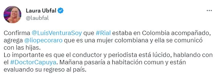 Horas más tarde, se supo con quién estaba el conductor al momento de sentirse mal. Según informó Laura Ufbal, Luis Ventura confirmó que Rial estaba acompañado y Lío Pecoraro agregó que esta persona era «una mujer colombiana». De hecho, ella fue la encargada en comunicarse con las hijas.