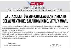 La Central de Trabajadores de la Argentina (CTA) que lidera el diputado nacional oficialista Hugo Yasky solicitó hoy al ministro de Trabajo, Claudio Moroni, el adelanto del incremento obtenido en el último encuentro del Consejo del Salario Mínimo, Vital y Móvil, para combatir la «aceleración de la inflación» agravada por el impacto del «conflicto bélico en Ucrania».