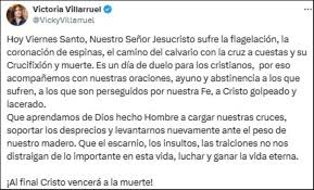 La vicepresidenta Victoria Villarruel publicó un mensaje religioso por Viernes Santo, cargado de simbolismo político, que generó interpretaciones sobre su tensa relación con el presidente Javier Milei y el círculo más cerrado del poder, el denominado «triángulo de hierro» conformado por Karina Milei, Santiago Caputo y el propio jefe de Estado.