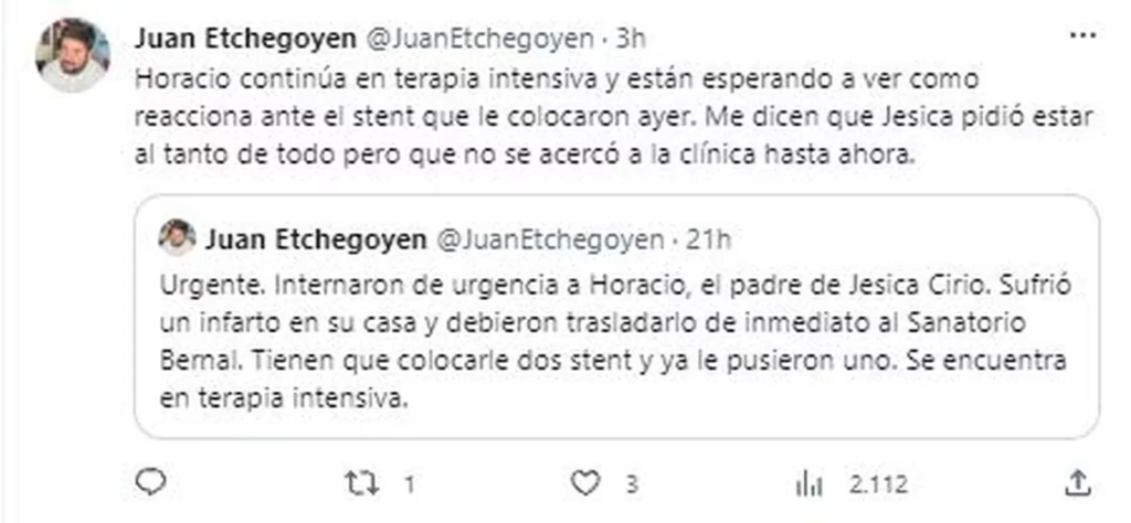 «Urgente. Internaron de urgencia a Horacio, el padre de Jésica Cirio. Sufrió un infarto en su casa y debieron trasladarlo de inmediato al Sanatorio Bernal. Tienen que colocarle dos stent y ya le pusieron uno. Se encuentra en terapia intensiva», escribió Etchegoyen en su cuenta de Twitter.