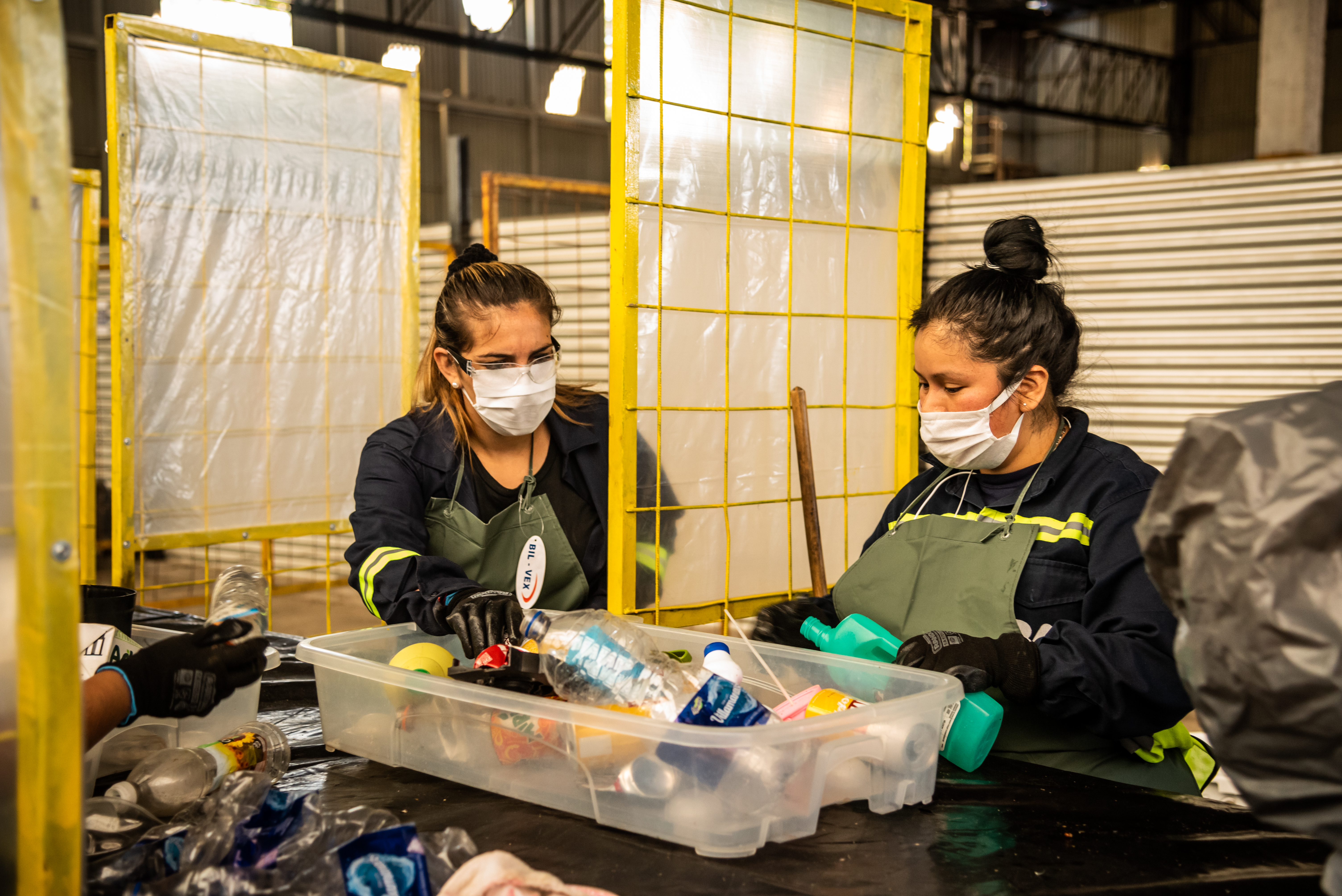 - En la mesa de separación se clasifican los residuos reciclables por tipo de material: vidrio, plástico, cartón, aluminio, nylon, entre otros.