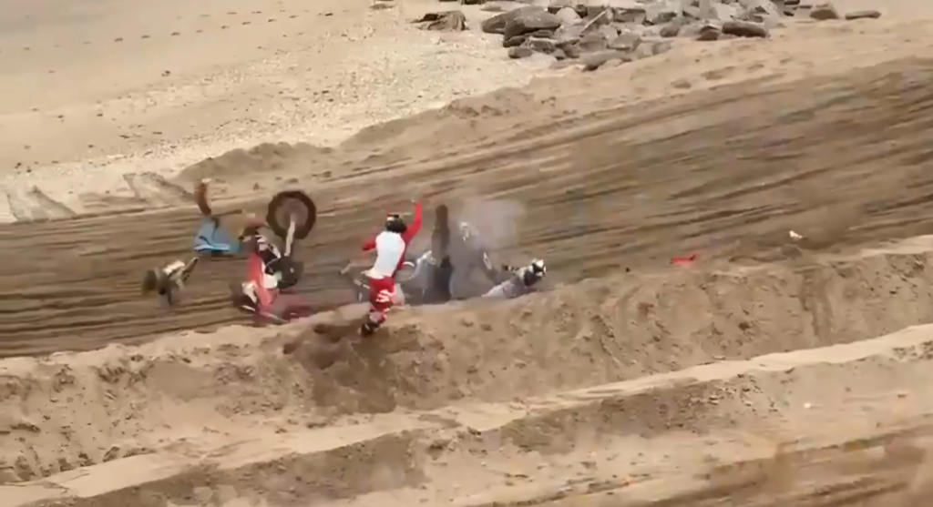 MAR DEL PLATA.- Cuatro pilotos resultaron heridos, dos de ellos con fracturas, en un violento accidente que ocurrió durante la jornada de pruebas de la edición 2024 del Enduro de Invierno que se disputa en un circuito dispuesto sobre distintas playas de la zona norte de esta ciudad.