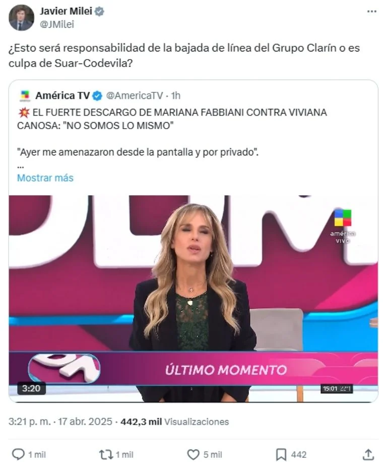 El presidente Javier Milei volvió a agitar el avispero mediático al pronunciarse en redes sociales sobre el conflicto que enfrenta a las conductoras Viviana Canosa y Mariana Fabbiani. Lejos de mantenerse al margen, el mandatario salió a respaldar a Fabbiani y cuestionó directamente a los responsables de la programación de Canal 13.