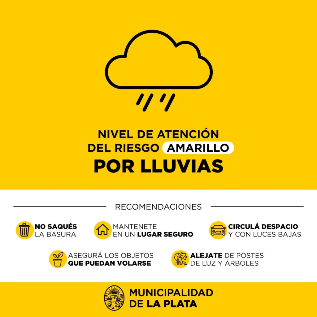 La Municipalidad de La Plata elevó a ‘amarillo’ el Nivel de Atención del Riesgo (NAR) ante las lluvias y los vientos pronosticados para los próximos días en la ciudad.