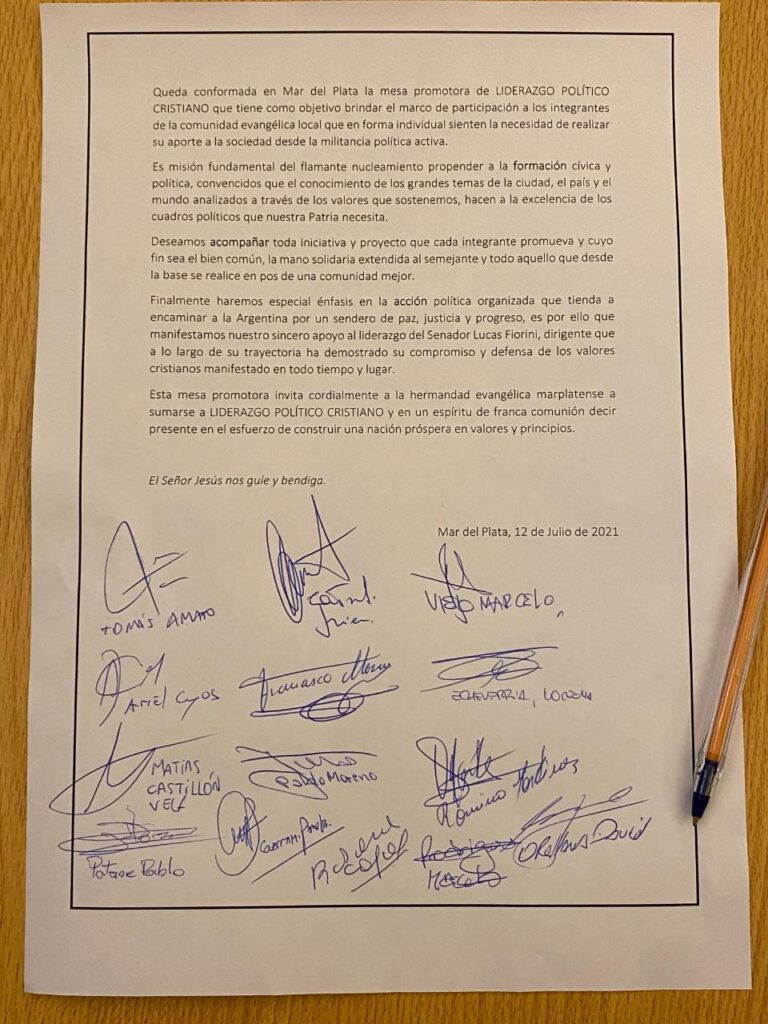 A continuación, los líderes evangélicos procedieron a firmar el documento. “Manifestamos nuestro sincero apoyo al liderazgo del senador Lucas Fiorini, dirigente que a lo largo de su trayectoria ha demostrado su compromiso y defensa de los valores cristianos expresados en todo tiempo y lugar.”