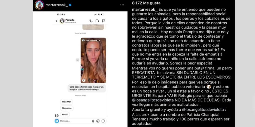 Una nueva batalla mediática en las redes sociales se hizo presente en la vida de Pampita luego que la influencer y proteccionista de animales, Mar Tarrés, publique un duro descargo en contra de la modelo en donde la acusó de no querer colaborar con la firma para la construcción de un refugio y compartió la conversación que tuvo en sus redes.