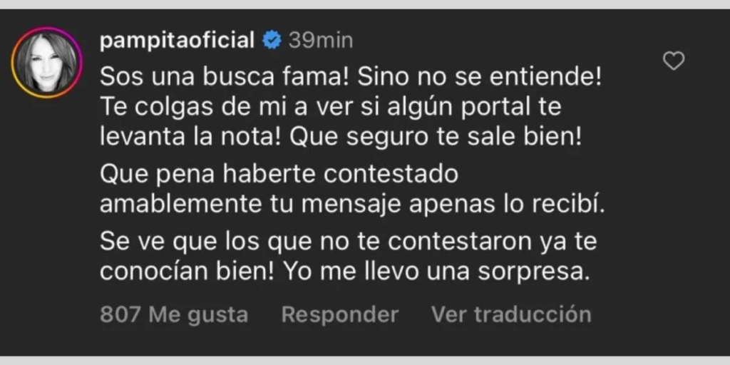 Resulta que Mar Tarrés hizo una publicación en su cuenta de Instagram en la que expuso la charla que había tenido con Pampita, en donde le solicitaba si podía firmar la petición, pero ante la negativa de la conductora de TV, la exparticipante del Bailando 2021 decidió difundir esta situación con un furioso mensaje
