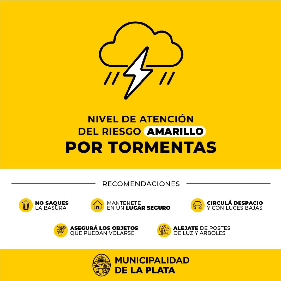 La Municipalidad de La Plata estableció el Nivel de Atención del Riesgo (NAR) ‘amarillo’ por tormentas entre la mañana y la tarde de este martes 17 de marzo.
