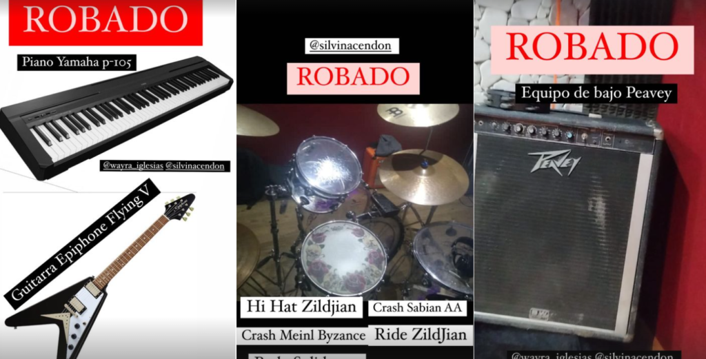 La instrumentista que integra los grupos Q’Acelga? y Pank Rayado, escribió en Instagram: “El sábado mientras estábamos en Concordia -donde La Renga congregó a 40.000 personas- entraron a robar a nuestra casa y se llevaron todo. Voy a publicar algunos de todos los instrumentos que se llevaron. Si los ven publicados en algún lugar contáctense conmigo o con alguien de mi familia, gracias”.