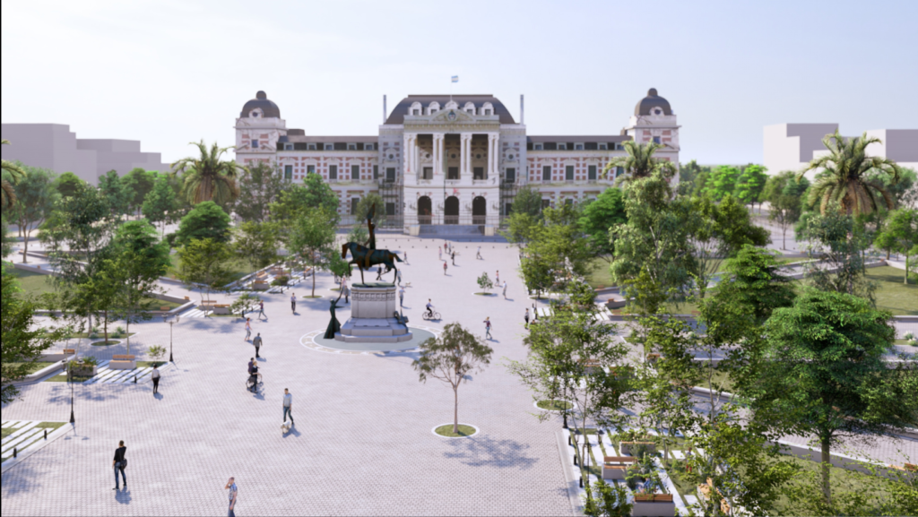 La revalorización de la plaza demandará un plazo de 6 meses y propone recuperar su valor institucional. Como parte de la propuesta, se contempla el reemplazo del solado actual por baldosas graníticas, manteniendo el lenguaje propio del eje fundacional y garantizando la unidad visual, y la creación de un Paseo del Arte y las Esculturas frente al Pasaje Dardo Rocha, vinculándolo con el espacio abierto de exposiciones del MACLA.